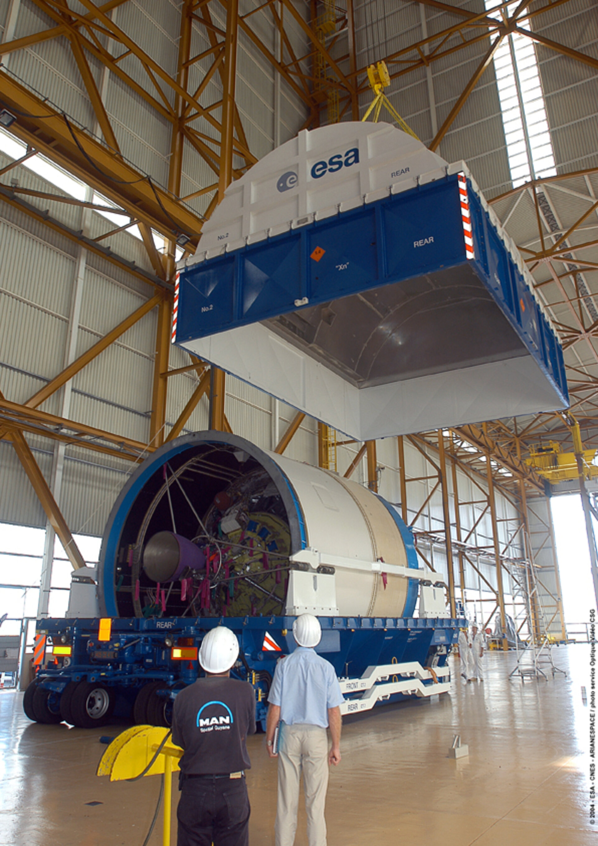 The ECA upper stage is unloaded from its transport container in the Launcher Integration Building (BIL) of the Ariane Launch Complex no.3 (ELA-3) at the Guiana Space Centre, Europe's spaceport