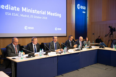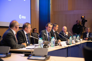 General view to press conference at ESAC in Spain. Diego Urbina and Charles Romain are accompanied by Javier Ventura-Traveset and Elena Feichtinger from ESA.
