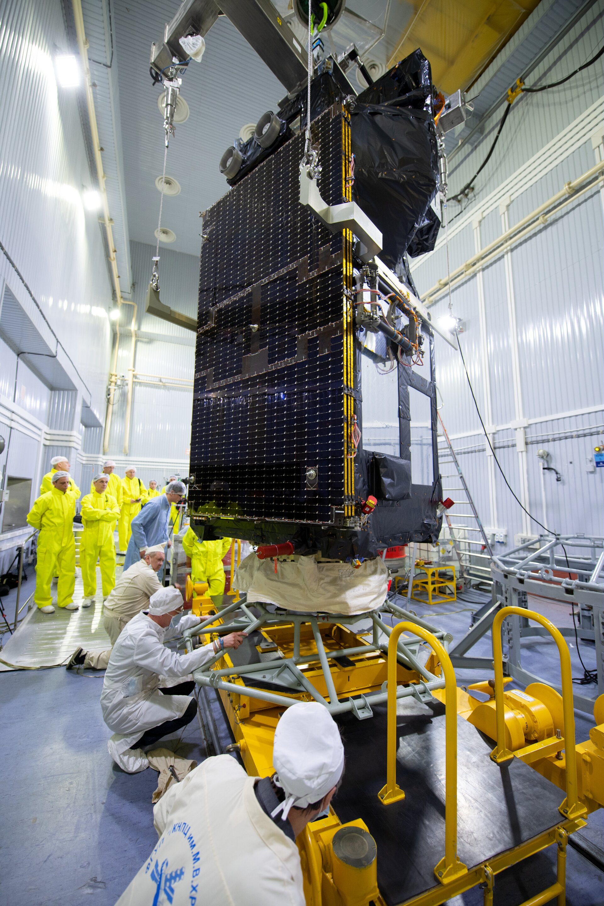 After being placed on the Rockot adapter, Sentinel-3B was placed on the yellow transport dolly to be moved to the MIK, where the satellite will be placed inside the Rockot fairing.The Copernicus Sentinel-3B satellite will be carried into orbit on a Rockot launcher, joining its identical twin, Sentinel-3A. The Sentinel-3 mission has been designed to measure systematically Earth’s oceans, land, ice and atmosphere to monitor and understand large-scale global dynamics. It will provide essential information in near-real time for ocean and weather forecasting.