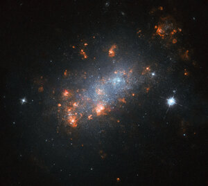 The galaxy featured here has a shape unlike many of the galaxies familiar to Hubble. Its thousands of bright stars evoke a spiral galaxy, but it lacks the characteristic ‘winding’ structure. The shining red blossoms stand out as well, twisted by clouds of dust — these are the locations of intense star formation. Yet it also radiates a diffuse glow, much like an elliptical galaxy and its core of older, redder stars. This galactic marvel is known to astronomers as NGC 1156.