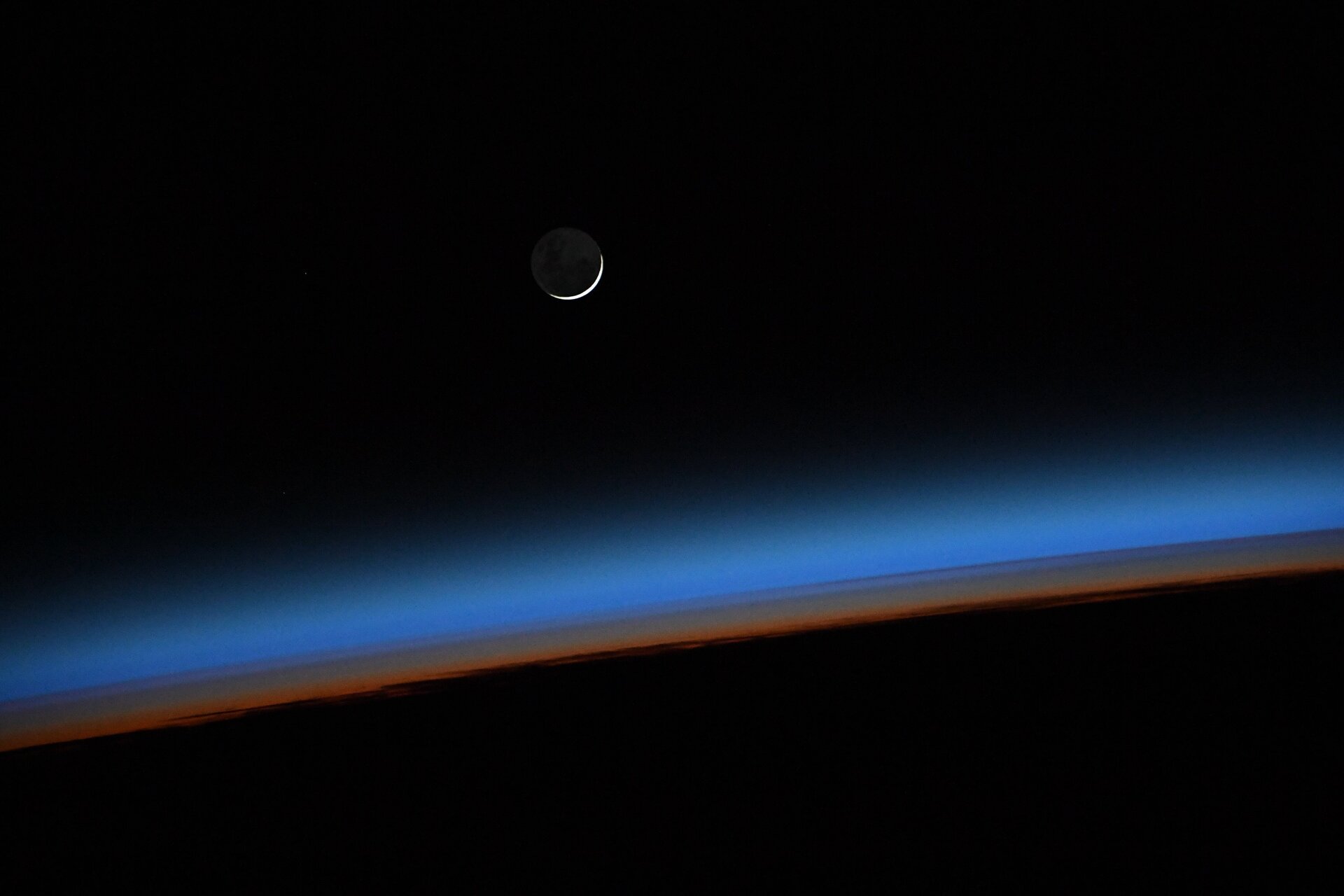 A rising new moon taken from the International Space Station by Samantha Cristoforetti. Earth's thin atmosphere can be seen in blue and orange.