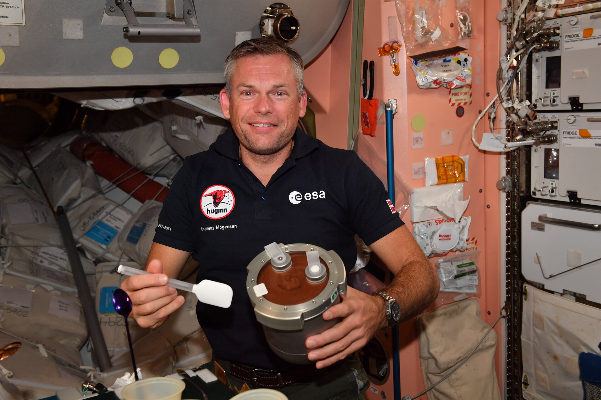 ESA astronaut Andreas Mogensen made chocolate mousse as part the French Space Agency's Food Processor experiment. The chocolate mousse was both delicious and airy, and Andreas shared the dessert with his crew mates on Expedition 70.