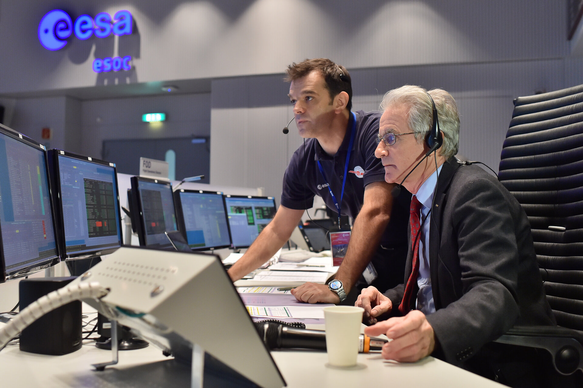 A happy Paolo Ferri and Andrea Accomazzo at ESOC the day that Rosetta landed successfully on Comet 67P/Churyumov-Gerasimenko, 12 November 2014.