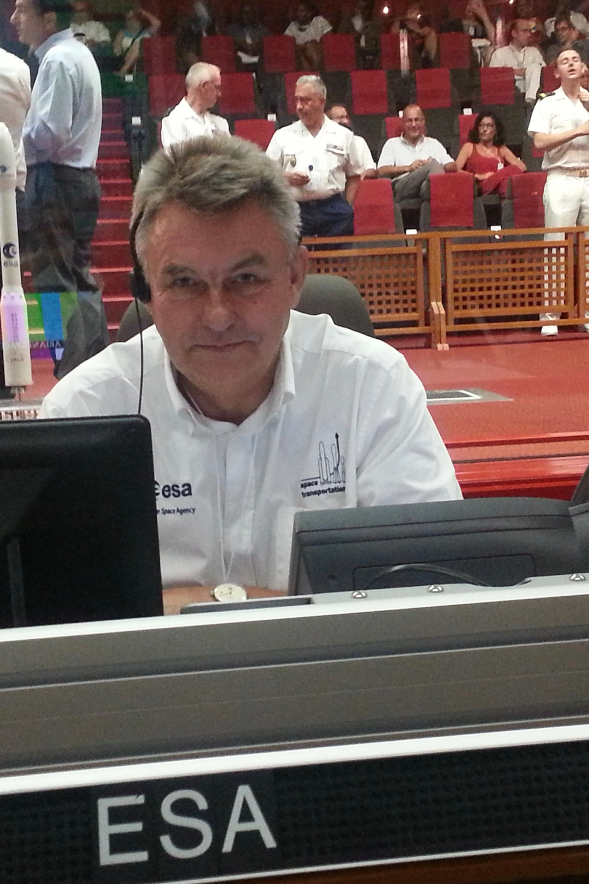 Rüdiger Albat, ESA Ariane 5 projects and programme manager, at work on launch day in the Jupiter Control Room at Europe's Spaceport in French Guiana.