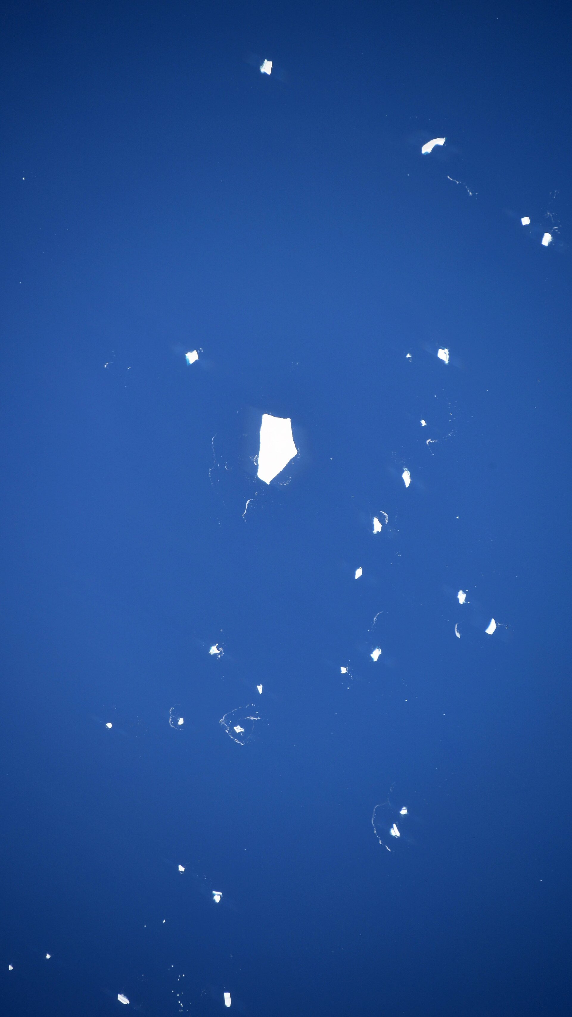 These are icebergs floating in the South Atlantic Ocean, where a group of smaller icebergs surround a much larger piece. Andreas captured this from the International Space Station and was surprised that it was possible to see icebergs from space. The contrast between the white iceberg and the blue ocean definitely helps spotting them as the Space Station flies over.