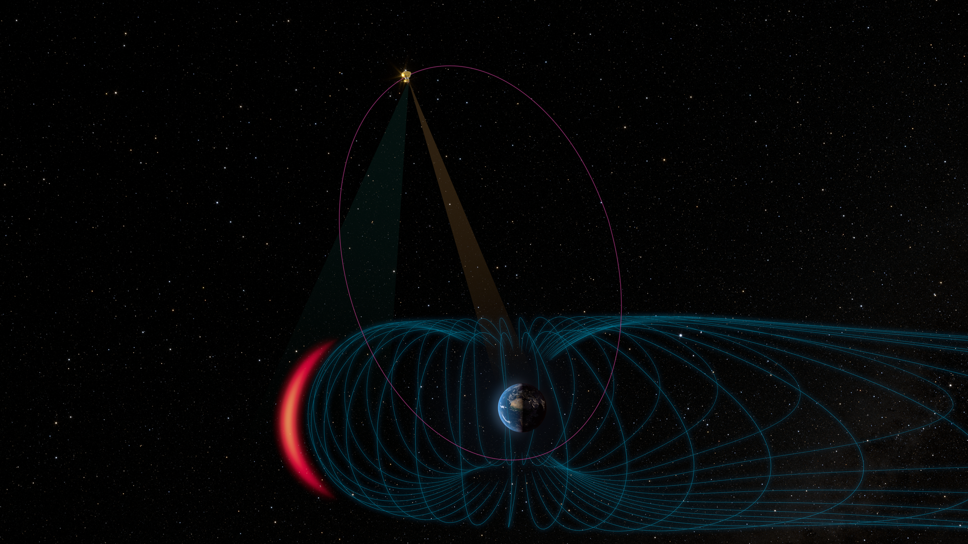 [Image description: The Smile spacecraft orbiting around Earth. The orbit takes it far above the north pole, where it peers down towards the edge of Earth's magnetic field with its X-ray camera, and towards the auroras with its ultraviolet camera.]
