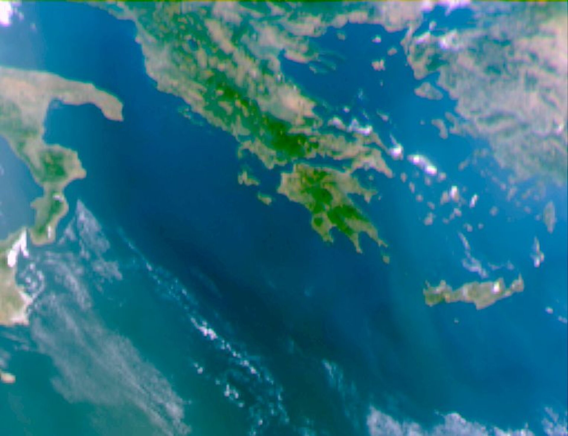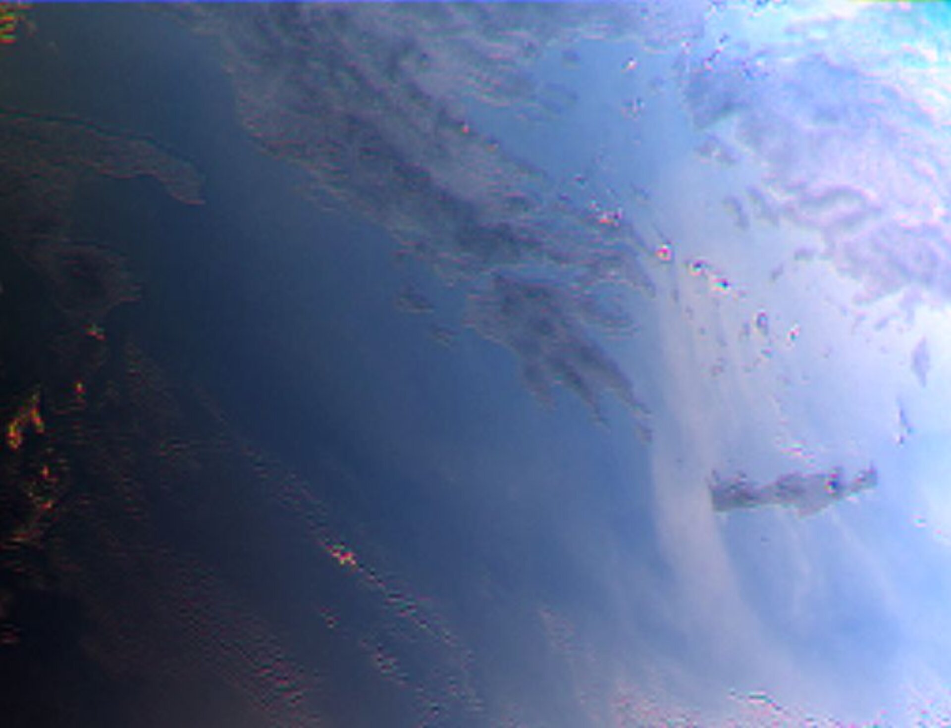 Here we see more detail from those first images. On the left we see a zoomed-in view showing Italy and Greece, with initial processing and corrections. The polarised right-hand image clearly shows smoke from fires over Southern Europe, which is far less visible in the natural light image on the left.