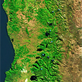 |  | Billede fra Landsat TM-sensor | | Dette kort viser den høje zone af Andesbjergene i regionen Araucanía. Regnskov vises med rød, græssletter med gul, søer med sort, klipper og lava fra vulkaner med blå og sne med magentarød.