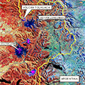 | | Deze afbeelding toont het hooggelegen Andesgebied in Araucanië. Natuurlijk bos is rood, grasland is geel, meren zijn zwart, rotsen en lava uit vulkanen is blauw en sneeuw is magenta.