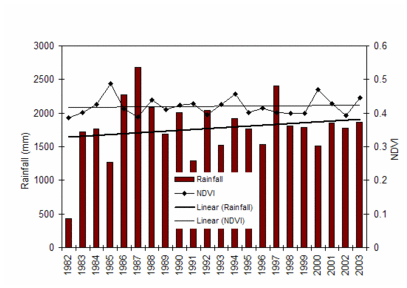 Hvad er NDVI? Det er vegetationsindekset kaldet Normalised Difference Vegetation Index, som måler mængden af plantedække og dets sundhedstilstand. NDVI kan beregnes ved hjælp af LEOWorks, og du kan prøve det med satellitdata for mindst to bånd. Nedbør (mm) og NDVI for perioden fra 1982 til 2003 for Cherrapuji | |