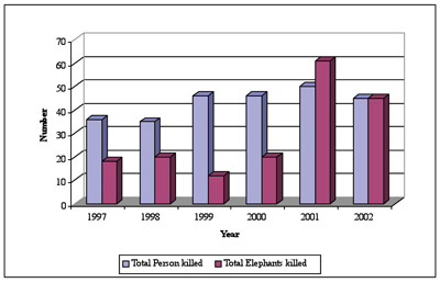 Ødelæggelse forårsaget af elefanter i studieområdet Illegal udvinding af brænde fra KSER Landmænd bygger vagttårne i træerne og overvåger deres afgrøder om natten Elefanter dræbt af vrede landsbyboere Dødsfald på grund af konflikten mellem menneske og elefant i Assam (1997-2002) | |