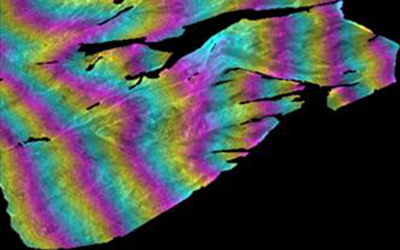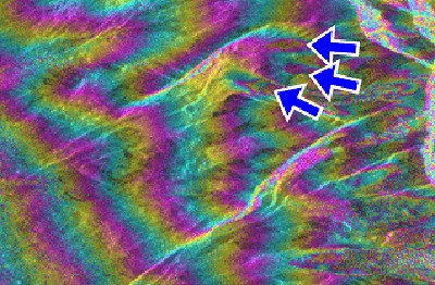 North is at the top, meaning the viewing direction from above is from left to right on the interferogram. The interferogram displays the phase differences as the distances from the satellite to the ground on 7 and 8 March 1996, as measured by the ERS SAR sensor.