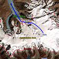 |  | ASTER satellite image of 29 May 2002 showing glaciers in the Himalayas | | Accumulation includes all processes that lead to a local increase of glacier mass. The accumulated snow is transformed to firn (i.e. old and compacted snow) and eventually into ice. Ablation includes all processes that lead to a local loss of glacier mass. As a glacier tends to balance its accumulation and ablation of mass under stable conditions, the ice mass flows slowly from the accumulation area towards the ablation area.