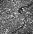 The city centre of Shanghai is seen here by spaceborne radar. The many bright points are large buildings and skyscrapers. East of the river, most of the bright dots represent a high building including the most famous one, the 'Oriental Pearl Tower', situated close to the river. The grey areas with small dots are produced by innumerable densely packed small houses. There are only four bridges over the Huangpu Jian. The Nanpu Bridge is just south of the river bend. The large access highway is visible as a straight dark band, but the bridge itself is dark as well and cannot be distinguished from the water.