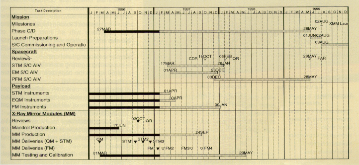 The project schedule for MM manufacture and testing (Fig. 2) shows their early delivery compared with the spacecraft itself, which is necessary for the timely testing and calibration of the scientific instruments, namely the European Photon Imaging Camera (EPIC) and the Reflection Grating Spectrometer (RGS).