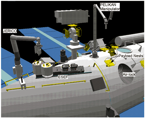 Figure 2 shows how the Jerico arm will be mounted onto a support bridge close to the end of the Spektr module cone. The task board and science payload will be installed on an adapted instrument platform called the European Space Exposure Facility (ESEF), onto which they can be loaded with the longer Pelikan manipulator arm.