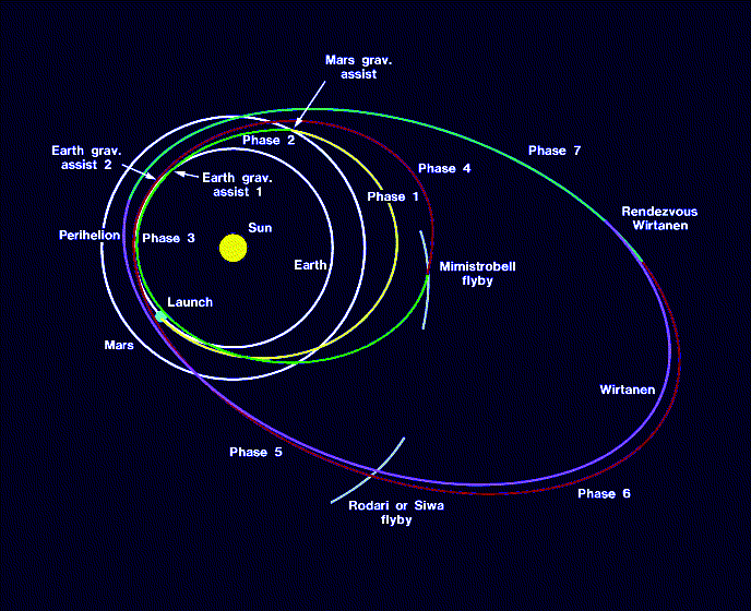 The baseline mission scenario foresees a launch by Ariane 5 in January 2003. One gravity-assist manoeuvre at Mars and two at Earth will provide the orbital energy for the spacecraft to rendezvous with Comet Wirtanen in August 2011 (Fig. 3.1.5). After the comet approach and an extensive mapping phase, science operations will start at 3.25 AU heliocentric distance. Shortly thereafter, the Lander will be deployed. The Orbiter will follow the nucleus very closely through perihelion at distances of the order of 2-20 nucleus radii.