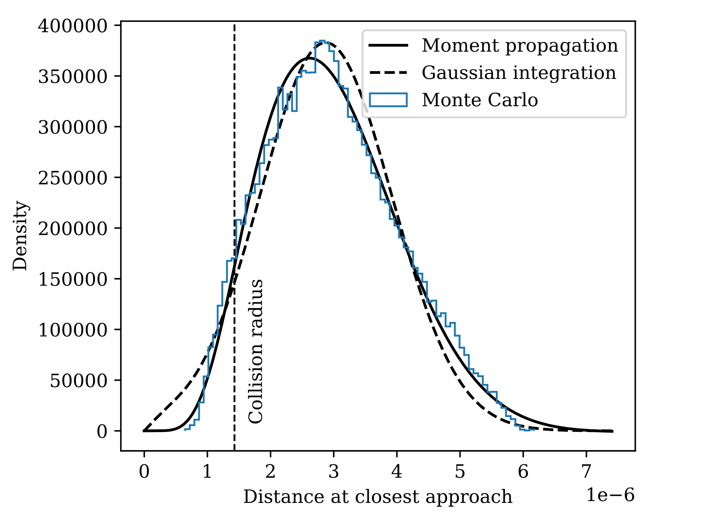 In this project, we build on recent advancements [1] that enable the propagation of high-order statistical moments of the initial uncertainty without imposing a Gaussian assumption. We use high-order multivariate Taylor polynomials to represent the flow of the dynamics and compute what we call event transition tensors at the point of closest approach. This approach maps the statistical moments from the initial conditions to the event at a variable future time, creating a flexible framework that extends beyond fixed-time predictions. However, converting these propagated moments into a probability density function (PDF), and ultimately into a probability of collision, poses an additional challenge. To address this, we go beyond the moment-propagation methodology and derive an analytical expression for the PDF of the closest approach distance during an uncertain conjunction. Our method infers the PDF from the statistical moments using orthogonal polynomials [2], yielding an analytical yet computationally efficient solution for computing probabilities in uncertain scenarios. This process does not rely on strong simplifying assumptions (e.g., Gaussian distribution, long or short-term encounters, etc.), thereby making the method general in nature and applicable to any dynamical system, also beyond that of satellite collisions.